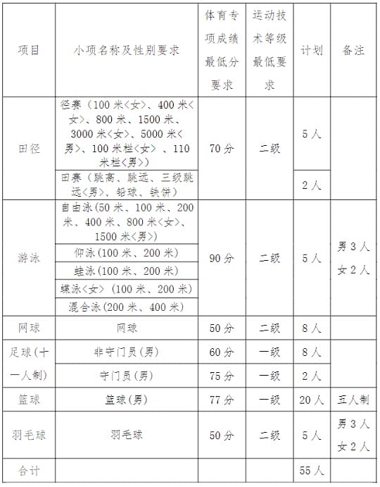 备注:1.未标注性别要求则不限男女;2.足球(十一人制,男,守门员)录取人数不多于2人;3.小项名称按照体育总局制定的《普通高等学校运动训练、武术与民族传统体育专业体育专项考试方法与评分标准》(2024版)为准;4.最终录取人数视生源情况及上级主管部门批复为准;5.优秀运动员保送生未完成计划用于运动训练专业录取,按照计划调整原则执行。